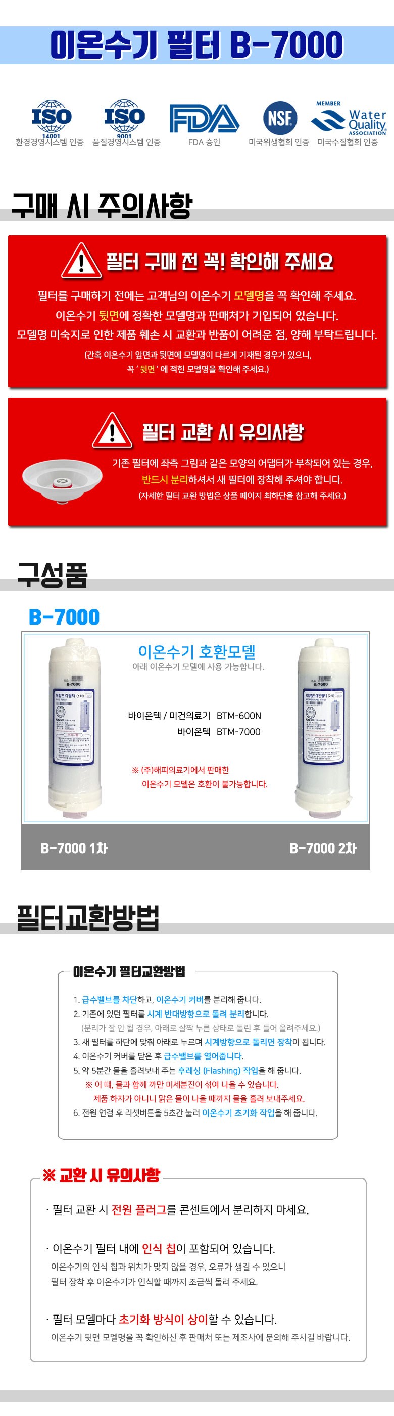 필수 표기정보 품명 및 모델명 바이온텍이온수기 호환필터 BTM-700 2차 인증/허가 사항 해당없음 제조국(원산지) 한국 제조자(수입자) 이온하이텍 소비자상담 관련 전화번호 쿠팡고객센터 1577-7011