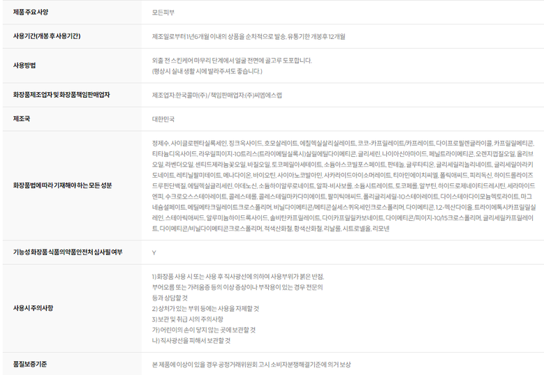 | 화장품제조업자 및 화장품책임판매업자 | 상품 상세페이지 참조 |